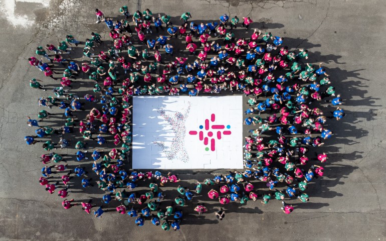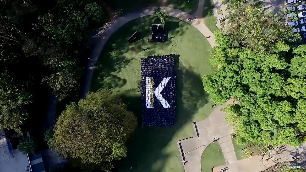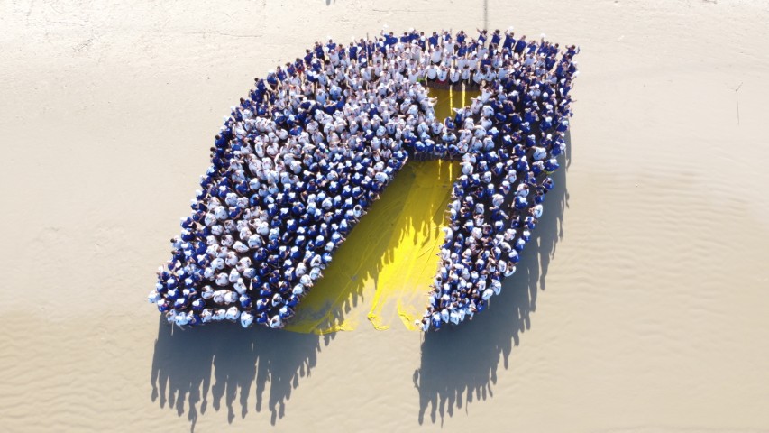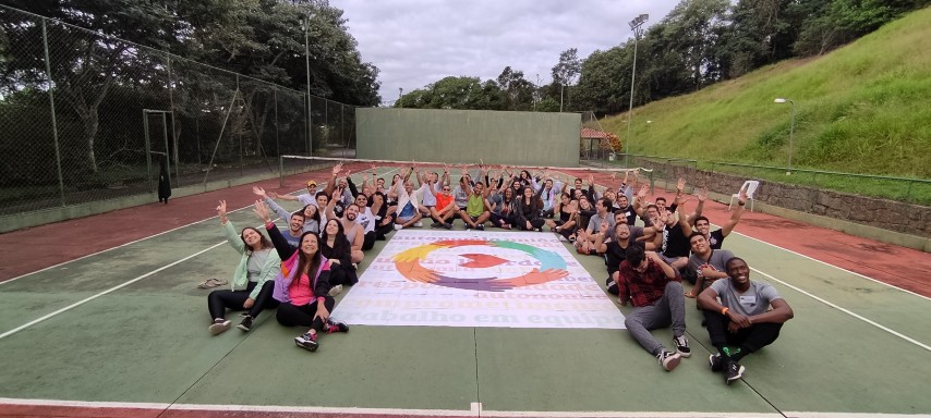 Atividade que consiste em montar um Mosaico Humano com folhas A2 sobre a cabeça ou ainda preencher um espaço capaz de formar uma frase ou logotipo.